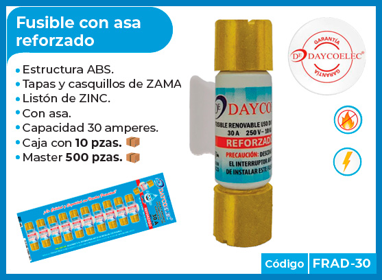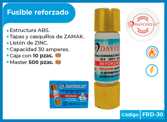 Fusible de policarbonato con fibra de vidrio, antiflama, tapas y casquillos de aleación de zinc, aluminio, magnesio y cobre (30 amperes).